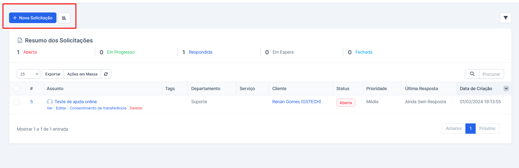 Para abrir uma solicitação basta clicar no botão "+ Nova Solicitação"