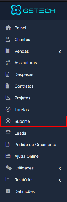 Para abrir um solicitação de suporte, clique no menu lateral e em seguida "Suporte"